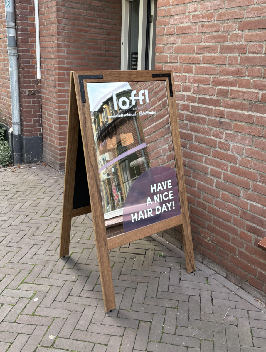 De bedrukking van je spiegelstoepbord ontwerpen en beletteren we volledig op maat in jouw huisstijl. Voor de omlijsting hebben we verschillende houten en metalen alternatieven getest. Het getoonde handgemaakte frame van FSC gecertificeerd hardhout bleek het meest betrouwbaar in stabiliteit, afwerking en duurzaamheid voor buitengebruik. Zo vormt het een sterke, duurzame drager voor het spiegelacrylaat en de bedrukking en weet je zeker dat je investeert in een spiegelstoepbord dat zijn uitstraling behoudt.