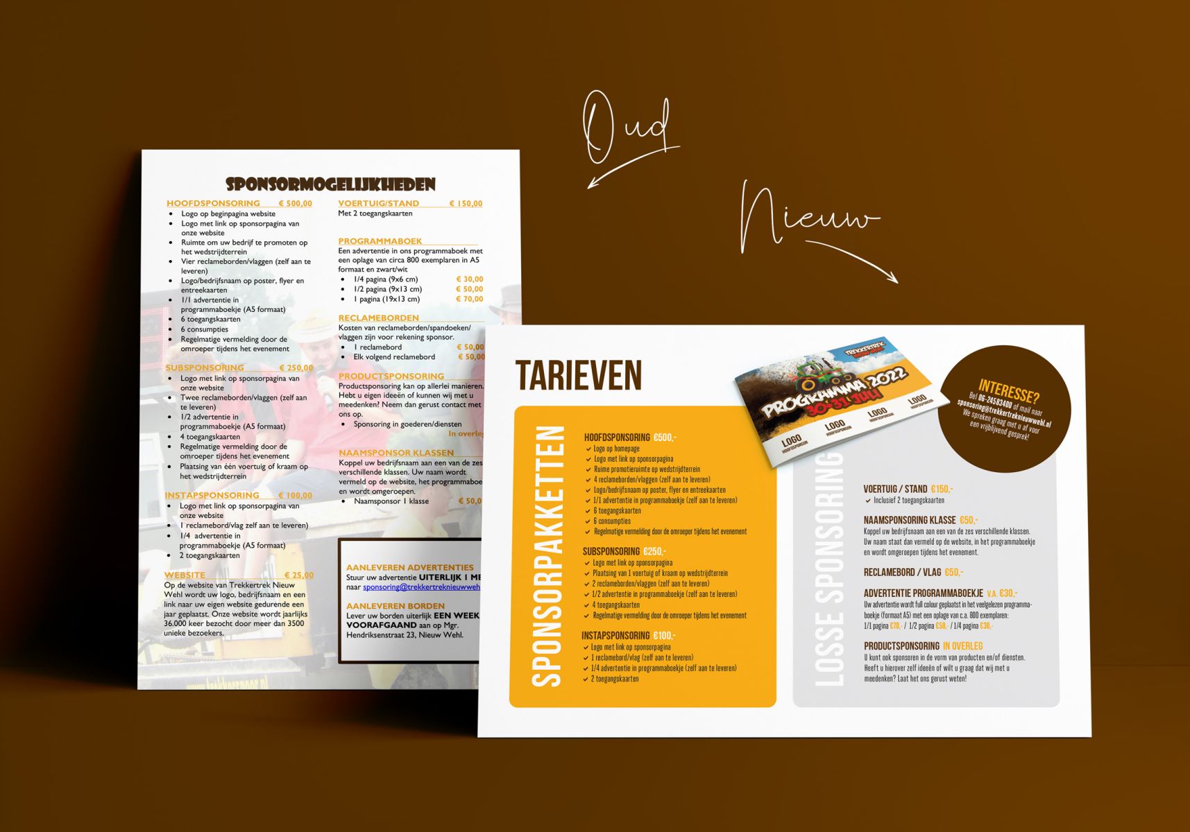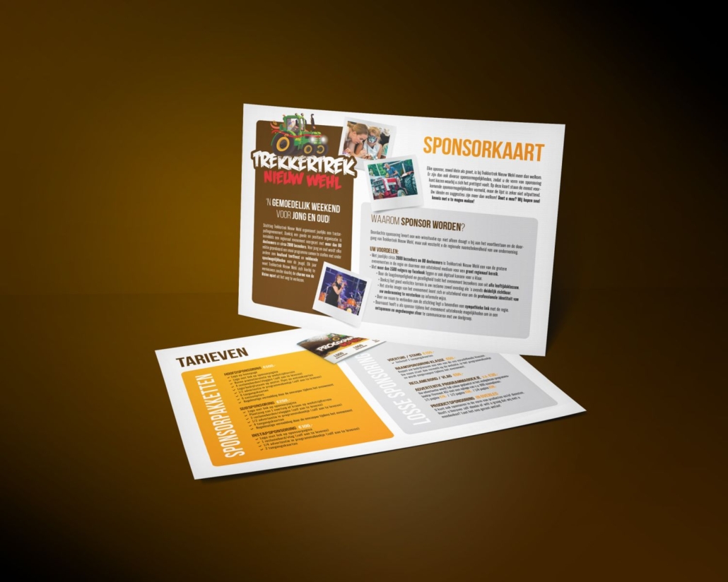 Om sponsoren te enthousiasmeren en informeren over de Trekkertrek Nieuw Wehl mochten we bij lekker in vorm de bestaande sponsorflyer in een nieuw jasje gieten. We kozen voor een liggende uitvoering en 2 versies (tarieven + specificaties) om alles overzichtelijk en wervend in beeld te brengen op een zakelijke maar toegankelijke manier.