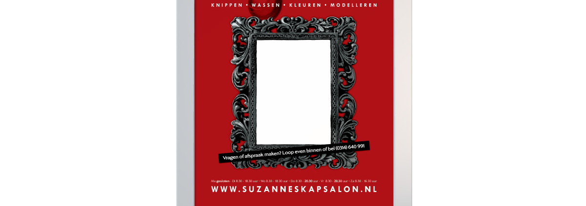 lekker in vom verzorgde voor Suzanne een posterontwerp voor in haar stoepbord aan de weg. Deze poster is afgedrukt op watervast PVC en daardoor lang houdbaar. In het midden is een A4-formaat aan ruimte vrijgehouden om eenvoudig en goedkoop een wisselende aanbieding te kunnen plaatsen.