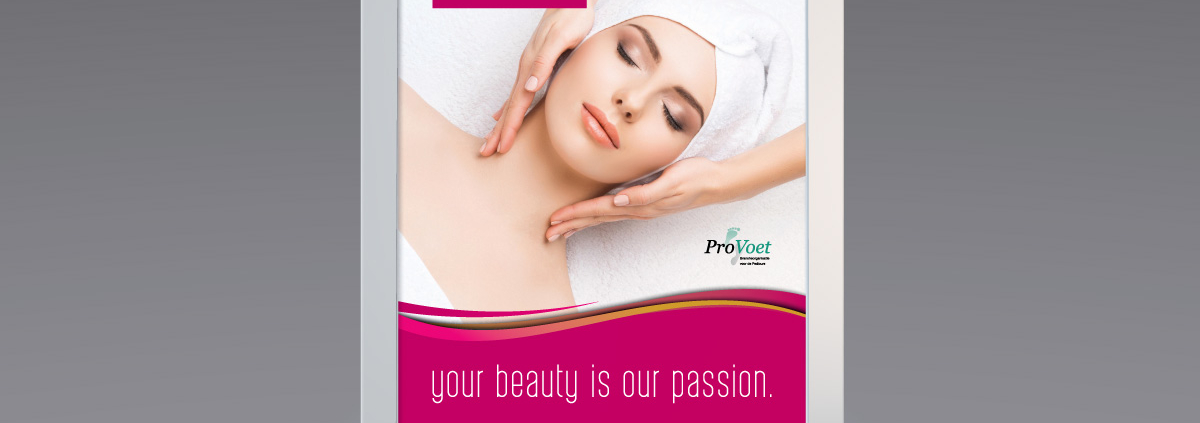 lekker in vorm maakte een sfeervol posterontwerp met herkenbare huisstijlelementen en daarna ook een bijpassend topbord in de vorm van een pijl, waardoor de salon voor niemand meer te missen is.