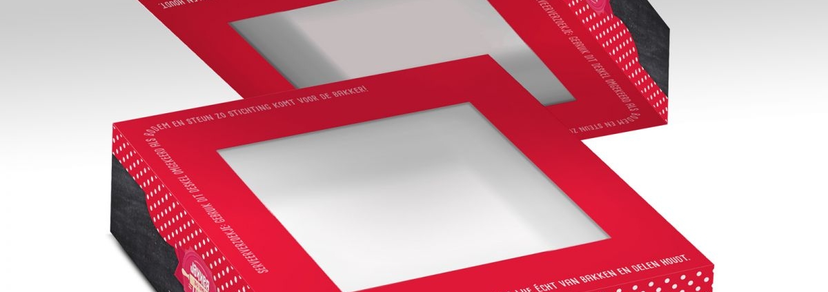 Om Stichting Komt voor de Bakker ludiek onder de aandacht te brengen bij kopers van Gaabs, hebben we een fullcolour zwanenhalsdoos ontworpen. Het verzoek aan klanten is om de gekochte taart of cupakes te serveren in het omgekeerde deksel. Op die manier ontstaat niet alleen een vrolijke en smaakmakende serveersuggestie, maar komt ook de boodschap van Stichting Komt voor de Bakker leesbaar in beeld voor alle gebak-eters.