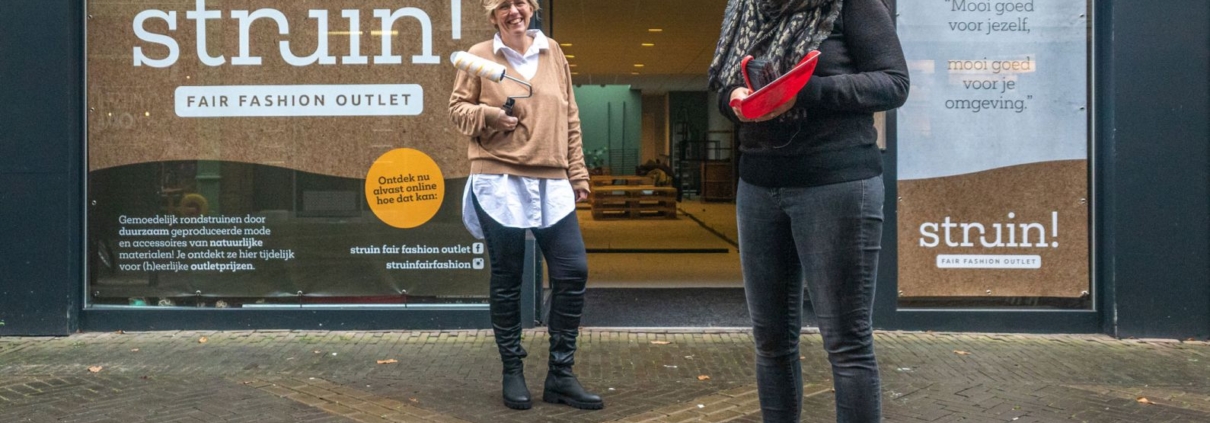 Terwijl ze bij struin! hard klussen om de winkel klaar te hebben voor de openingsdatum, zorgen tijdelijke etalagedoeken ervoor dat het uitzicht informerend en enthousiasmerend blijft. Bij lekker in vorm mochten we ze vormgeven.