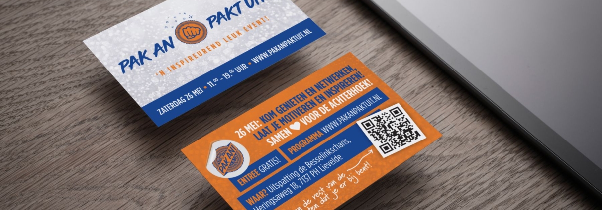 Om coaches, sponsoren en gehonoreerde initiatieven van Stichting Pak An de mogelijkheid te geven hun achterban te enthousiasmeren voor het evenement Pak An Pakt Uit, bedachten we bij lekker in vorm deze handzame uitdeelkaartjes. Op visitekaartjes formaat lees je zo alle benodigde informatie overzichtelijk op een rijtje.