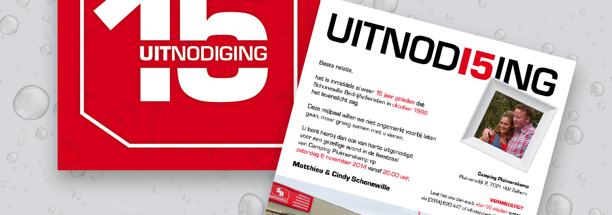 Het is inmiddels al weer 15 jaar geleden dat Schonewille Bedrijfsdiensten in oktober 1999 het levenslicht zag. lekker in vorm ontwierp de uitnodiging voor het jubileumfeest en liet deze drukken op een sprankelend ice silver metallic papier.