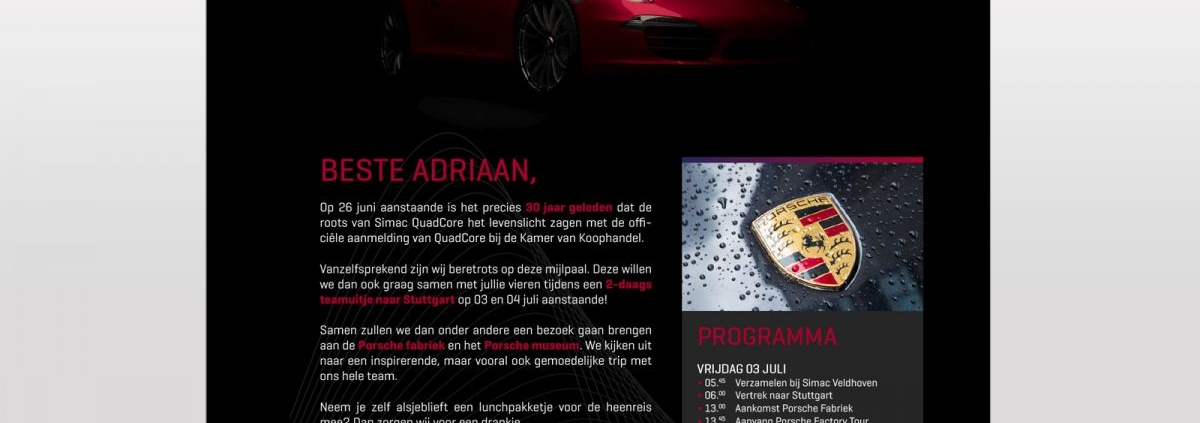 Simac Quadcore bestaat 30 jaar en trakteert haar medewerkers op een teamuitje naar Frankfurt, met onder andere een bezoekje aan de Porschefabriek daar. Bij lekker in vorm mochten we er deze gepersonaliseerde digitale uitnodiging voor schrijven en ontwerpen.