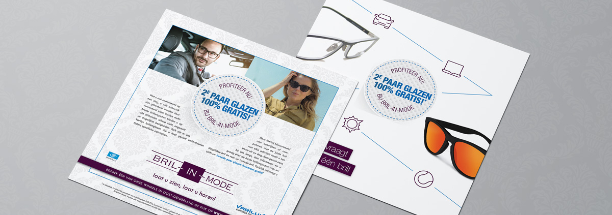 De reclamecampagne met de titel “Uw dag vraagt om meer dan één bril” loopt in lijn met de landelijke Essilor campagne en wordt onder de aandacht gebracht via onder andere een direct mailing naar vaste klanten en huis-aan-huis flyers met een opvallende kruisslag vouw. Deze mailingen worden ondersteund door diverse point-of-sale items in de winkel en op het web. Hierboven valt ook de bijbehorende reclamespot voor de regionale radio te beluisteren.