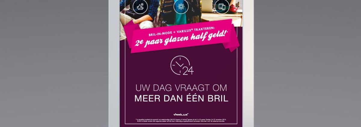 De reclamecampagne met de titel “Uw dag vraagt om meer dan één bril” loopt in lijn met de landelijke Essilor campagne en wordt onder de aandacht gebracht via onder andere een direct mailing naar vaste klanten en huis-aan-huis flyers met een opvallende kruisslag vouw. Deze mailingen worden ondersteund door diverse point-of-sale items in de winkel en op het web. Hierboven valt ook de bijbehorende reclamespot voor de regionale radio te beluisteren.