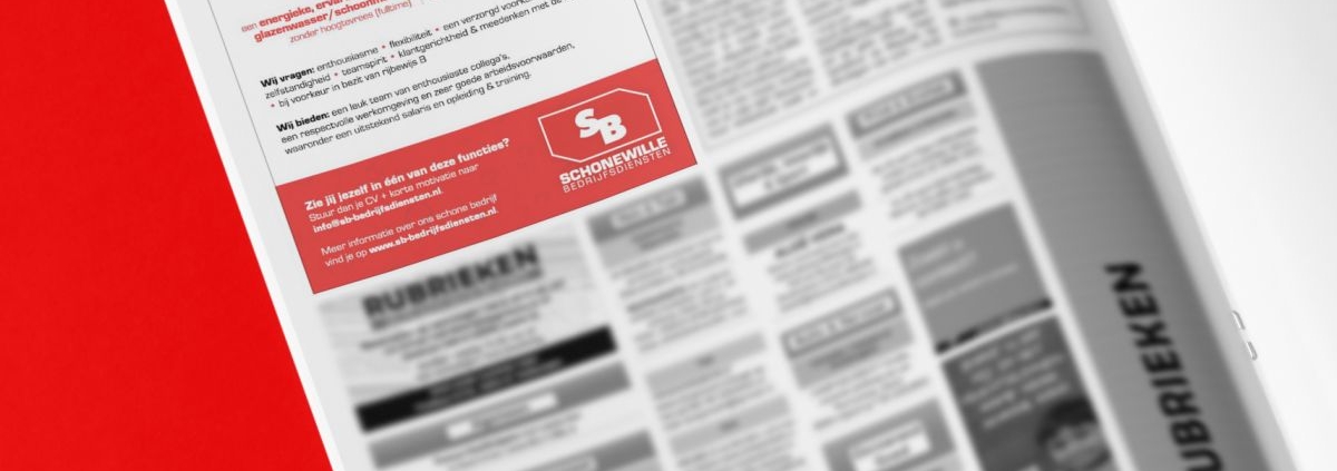 Schonewille Bedrijfsdiensten zoekt ter aanvulling op hun enthousiaste team van Nette Jongens m/v een energieke, ervaren allround glazenwasser/schoonmaker en een frisse interieurverzorger. Bij lekker in vorm verzorgden we de copy, de opmaak en de mediaplanning van een mooie vacature. Deze verscheen zowel offline in Contact en Doetinchems Vizier als online op Indebuurt en social media.