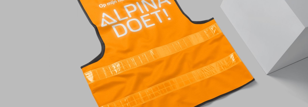 Diks Verzekeringen in IJsselstein heet voortaan Alpina. In het verlengde van de landelijke actie NLdoet vier het team haar rebranding op volledig eigen wijze onder de naam ALPINAdoet. De medewerkers dragen in de openingsweek op hun eigen manier bij aan lokaal maatschappelijke projecten. Daarvoor mochten we bij lekker in vorm dit veiligheidshesje ontwerpen. Zo kan iedereen veilig de handen uit de mouwen steken!