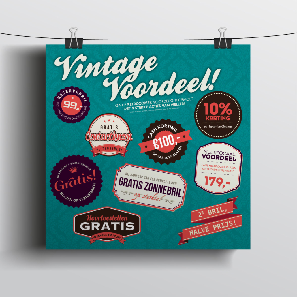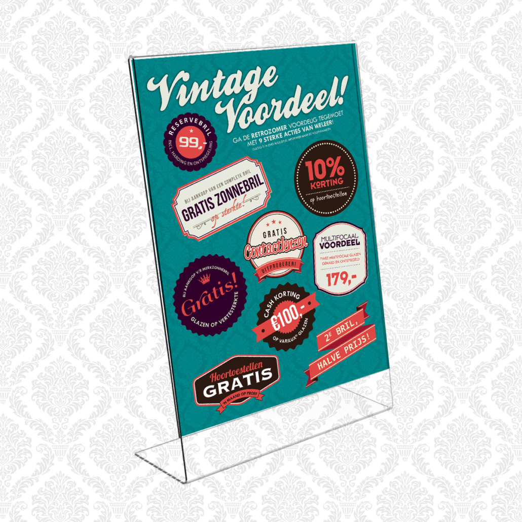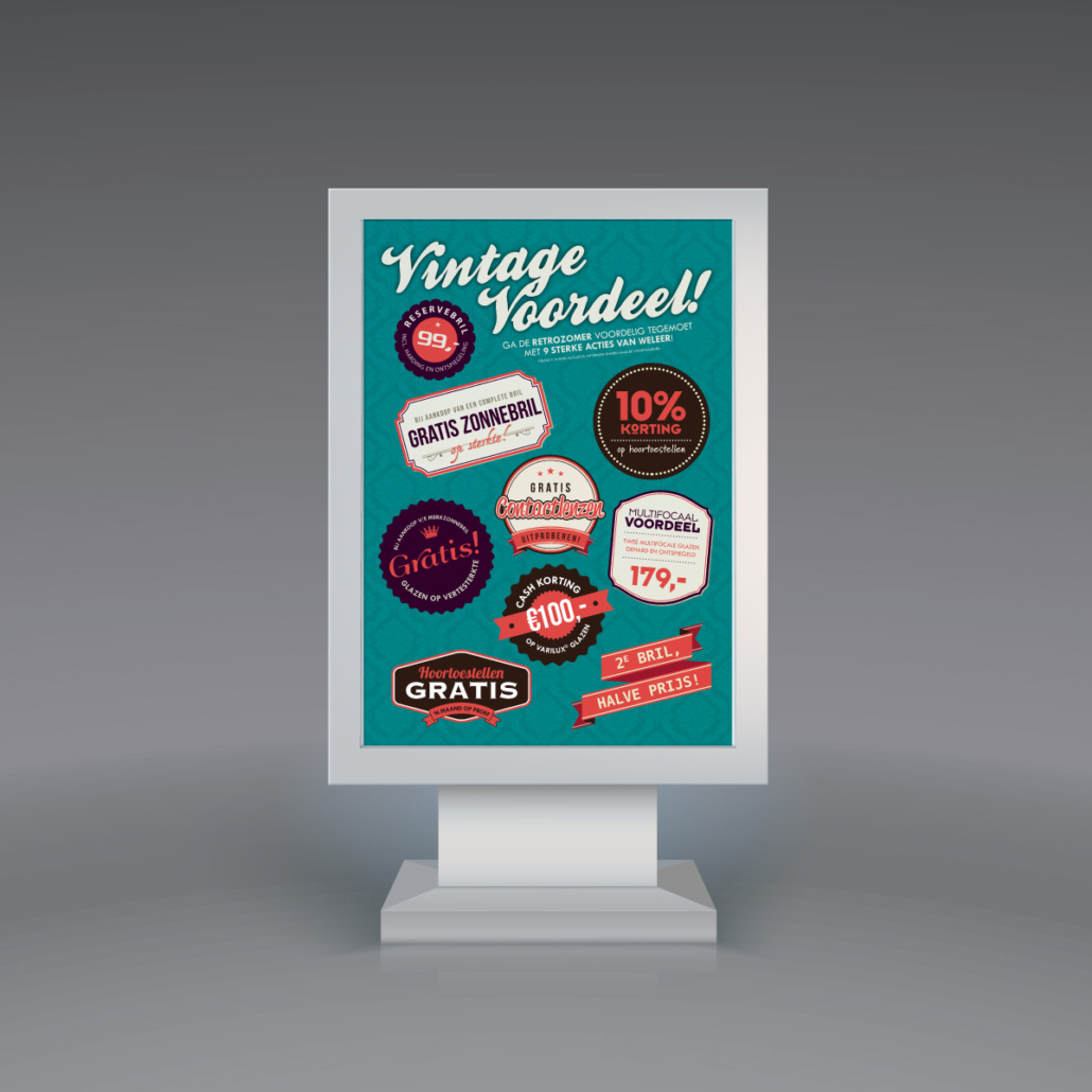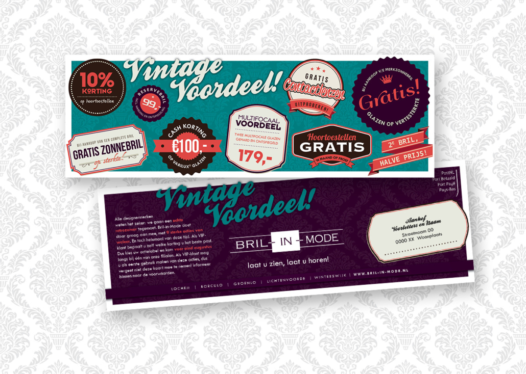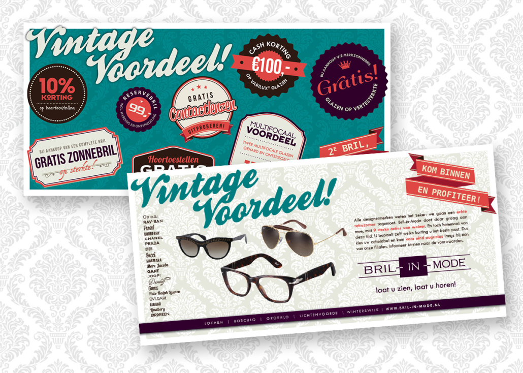 lekker in vorm ontwierp een knallende retroactie voor Bril-in-Mode: Vintage Voordeel. De campagne werd uitgebreid onder de aandacht gebracht middels een direct mailing naar vaste klanten, huis-aan-huis flyers, advertenties en diverse items in en rondom de winkel.