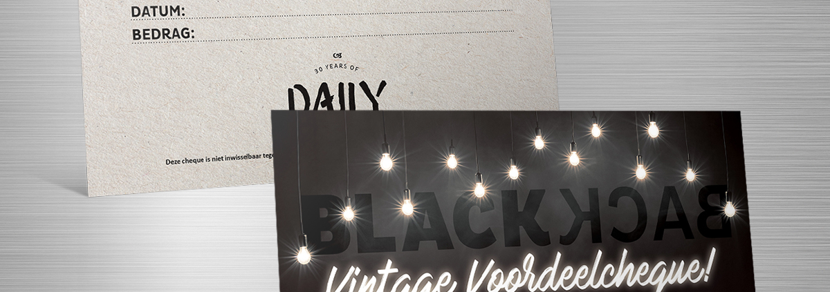 Daily Women’s Wear start in 2016 een mooi jaarlijks terugkerend initiatief: Gun uw mooie, gedragen Daily kleding een tweede ronde en verdien zelf tegelijkertijd leuk shoppingtegoed. Goed voor het milieu en goed voor de portemonnee. lekker in vorm doopte het tot de BlackBack Vintage Voordeelmarkt en ontwierp ter ondersteuning een stoepbordposter, flyer, voordeelcheque en folder, allemaal met een – zeker voor Daily – sterke vintage uitstraling. De respons was enorm hoog, dus dat biedt goede hoop voor de komende jaren!