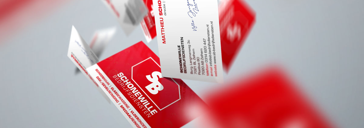 De bestaande visitekaartjes van Schonewille Bedrijfsdiensten worden voortaan voorzien van een pay-off, die nonchalant met de hand lijkt te zijn toegevoegd als persoonlijke noot. De afwerking met spot-UV lak op de voorzijde zorgt nog steeds voor een prachtig effect van natte druppels.