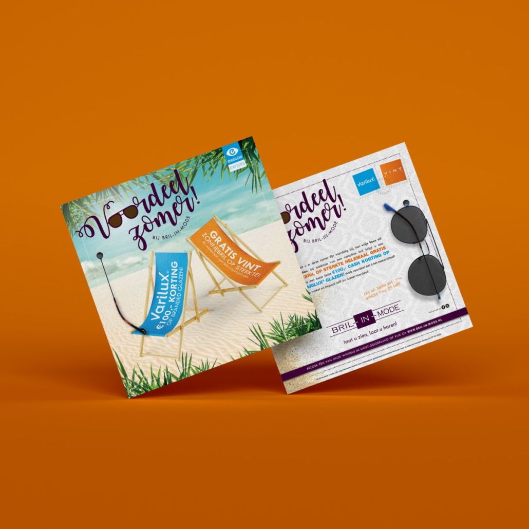Bij lekker in vorm mochten we voor deze zonnige campagne diverse items fotograferen, schrijven en natuurlijk vormgeven. Eerst met een artikel in de Retina en vervolgens voor de kracht van herhaling via direct mail en huis-aan-huis flyers. Ook in de winkel en online zorgden we voor diverse actiemedia, waaronder een forex brillendisplay om het beschikbare assortiment feestelijk te tonen.