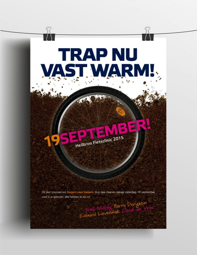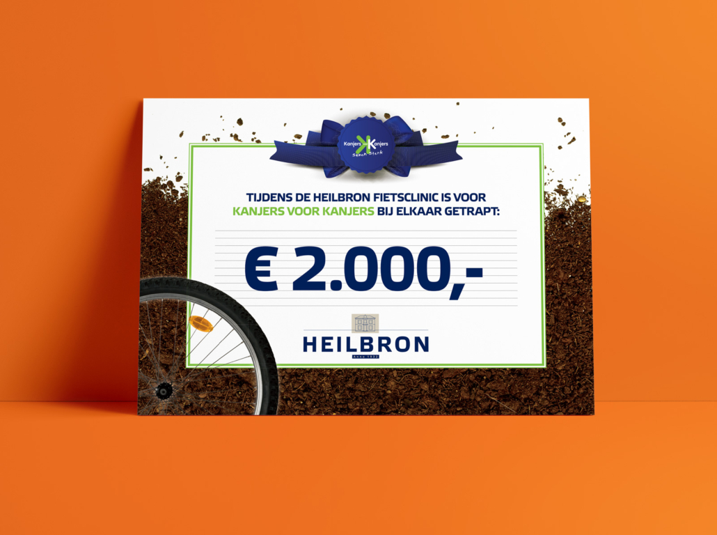 Kanjers voor Kanjers was dit jaar het goede doel waarvoor Heilbron met haar relaties ging fietsen tijdens de jaarlijkse fietsclinic. Bij lekker in vorm mochten we hiervoor allereerst een aankondigingsposter ontwerpen. Daarna ontvingen relaties bij het inschrijven alvast een mooie glimmend bewijs van deelname (gedrukt op spiegelend magic chrome papier) met daarop alle relevante gegevens. Tot slot ontwierpen we nog een cheque die uiteindelijk overhandigd werd aan Kanjers voor Kanjers.