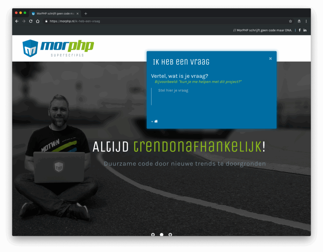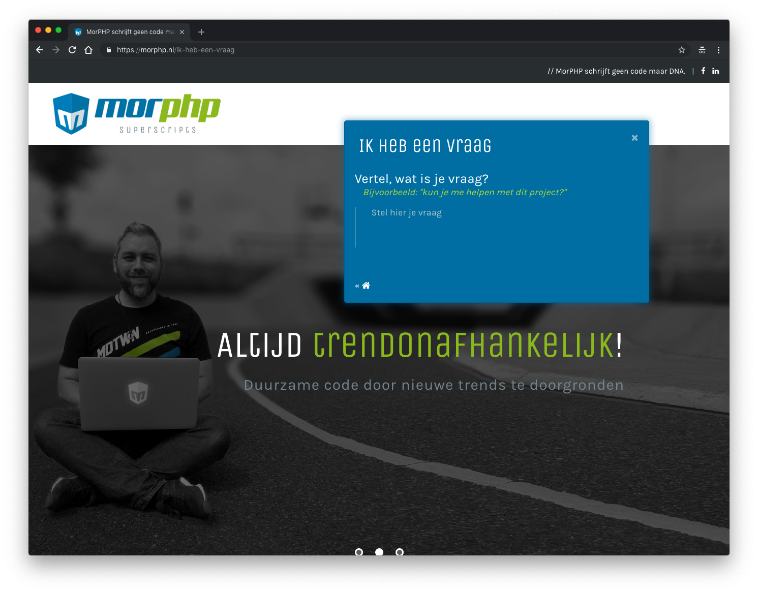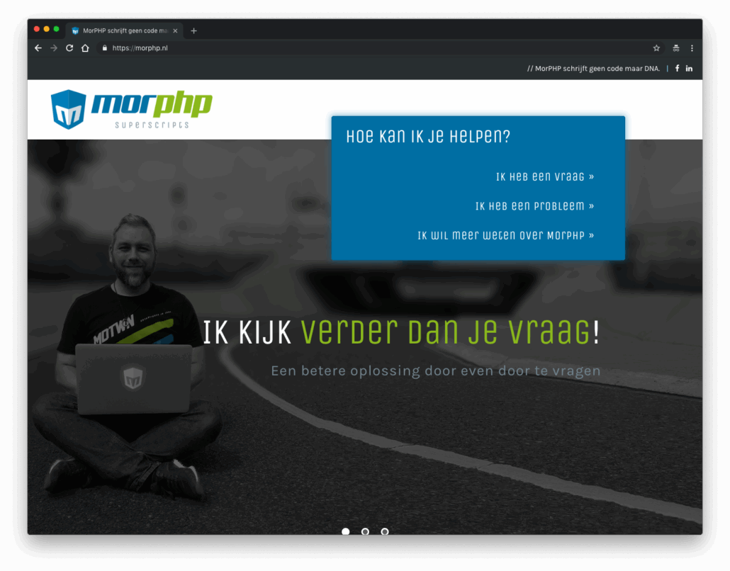Websites coderen kan Patrick Morpey van MorPHP als geen ander, maar over de vormgeving en branding van zijn website mochten we bij lekker in vorm creatief meedenken. Samen hebben we een aangekocht 1-page template qua functionaliteit en uitstraling omgetoverd tot een sterk online merkverhaal. Met een custom made contactmodule, bondige teksten, passende fotografie en kloppende huisstijlkleuren.