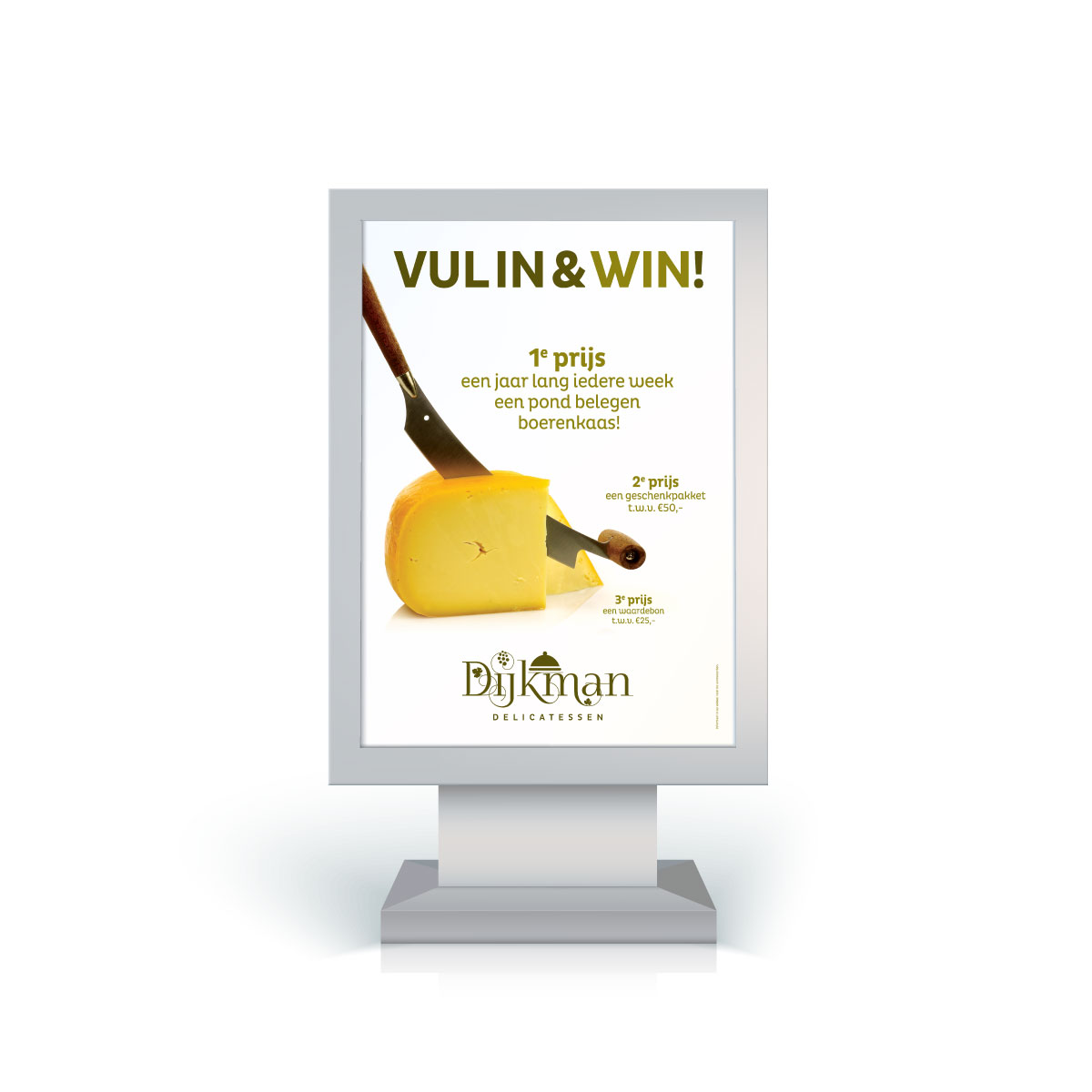 Ter gelegenheid van de opening van de nieuwe winkel voert Dijkman Delicatessen een vul in & win-actie. Bij inlevering van de ingevulde actiebon maken klanten kans op smaakvolle prijzen. lekker in vorm maakte het stoepbordontwerp en de vul in & win-bon.