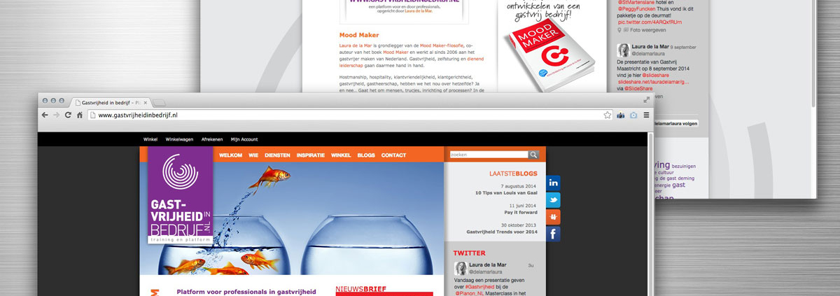 Op basis van het open source systeem WordPress liet Laura de la Mar twee bij elkaar passende websites bij lekker in vorm ontwerpen. Beide sites bevatten koppelingen met social media en bieden zo telkens vernieuwende content. www.lauradelamar.nl en www.gastvrijheidinbedrijf.nl