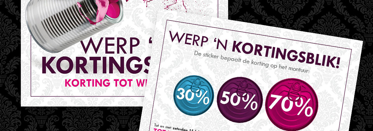 Het is sale bij Bril-in-Mode. De kleur sticker bepaalt de korting op het montuur. De campagne, genaamd ‘werp ’n kortingsblik’ wordt uitgebreid onder de aandacht gebracht middels een direct mailing (presale) naar vaste klanten, huis-aan-huis flyers, advertenties en diverse items in en rondom de winkel.
