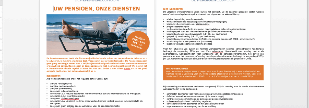 Om de beheerovereenkomsten en de dienstenoverzichten die medewerkers van De Pensioenecnoom in Word maken ook van de juiste huisstijl te kunnen voorzien, ontwierpen we bij lekker in vorm een vooringevuld Word-sjabloon met makkelijk toepasbare alineastijlen op maat.