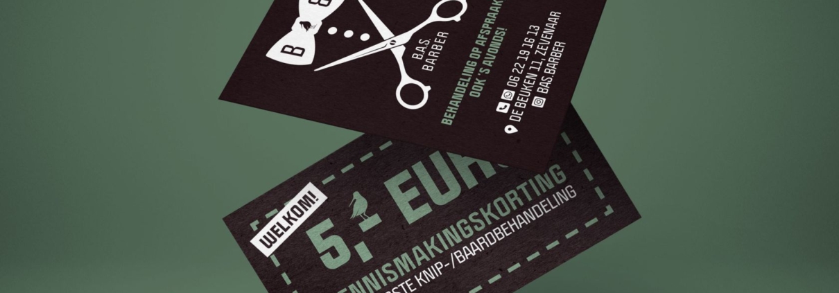 Bij lekker in vorm ontwierpen we voor Bas Barber dit visitekaartje, dat tegelijkertijd dienst doet als kortingscoupon voor een eerste kennismaking. Voor extra beleving lieten we het met witte inkt drukken op mat zwart papier.