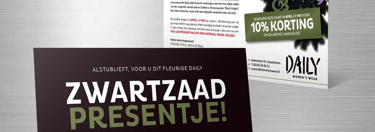 Tijdens de “Awakenings” V.I.P dagen ging je als bezoeker bij Daily Women’s Wear naar huis met een passend cadeau: Het Zwartzaad Presentje, bestaande uit een zakje met zaden van de Scabiosa Atropurpurea ‘Black Knight’ en een waardebon t.w.v. 10% korting voor wanneer de bloem in bloei staat. lekker in vorm dacht mee over dit concept en mocht daarna vanzelfsprekend het artwork verzorgen. Oh, en natuurlijk hadden we ook braaf een exemplaar in de achtertuin!